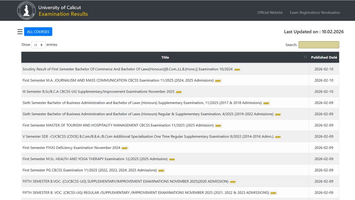 The University of Calicut has announced the results for undergraduate (UG), postgraduate (PG), professional, vocational and distance courses. The candidates who had appeared for Calicut University UG, PG exams 2025 can check the result on the official website- results.uoc.ac.in. The Calicut University UG, PG scorecard 2025 pdf login credentials are- application number, date of birth.